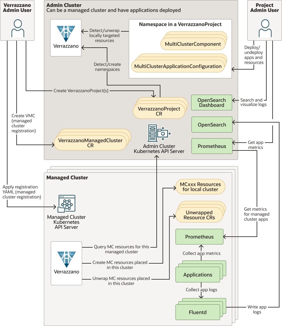 - Viewing logs and metrics for both Verrazzano Components and applications that reside in the managed clusters.